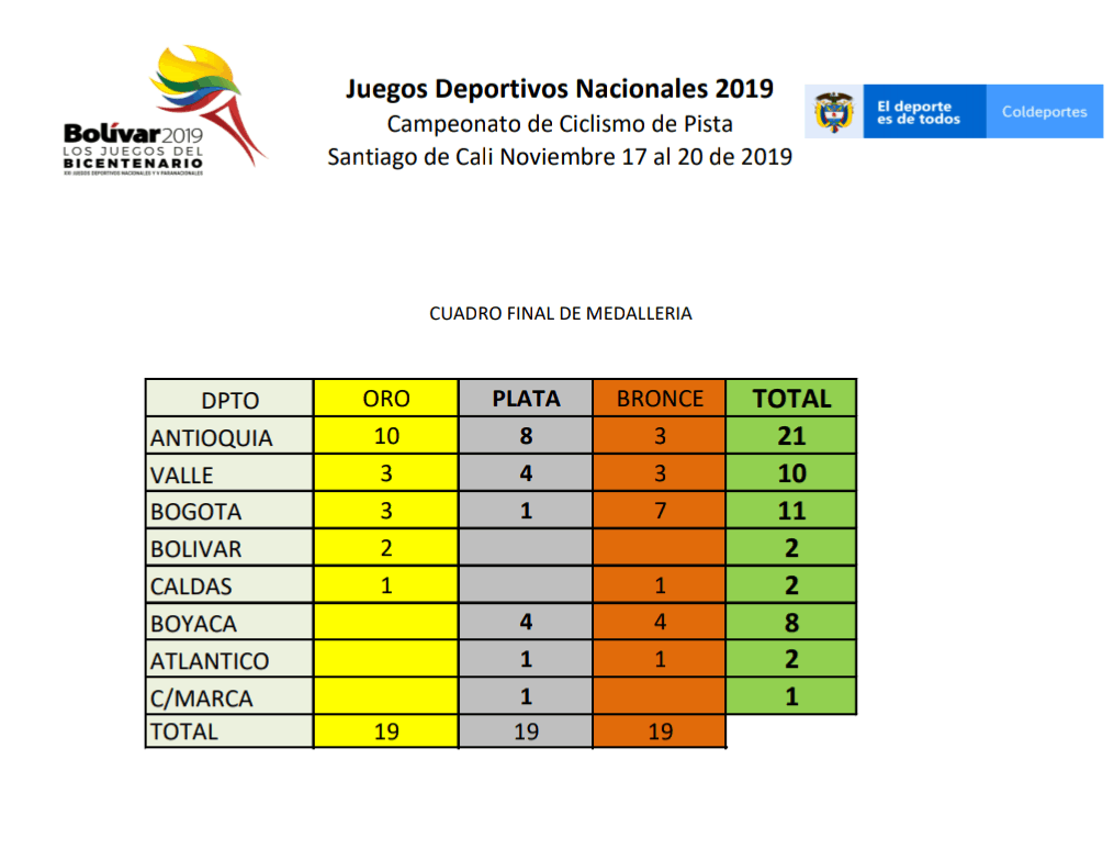 La delegación de Antioquia dominó, de principio a fin, la tabla de medallería de los Juegos Nacionales de pista, que este miércoles cerraron su cronograma oficial de competencias en el velódromo Alcides Nieto Patiño.