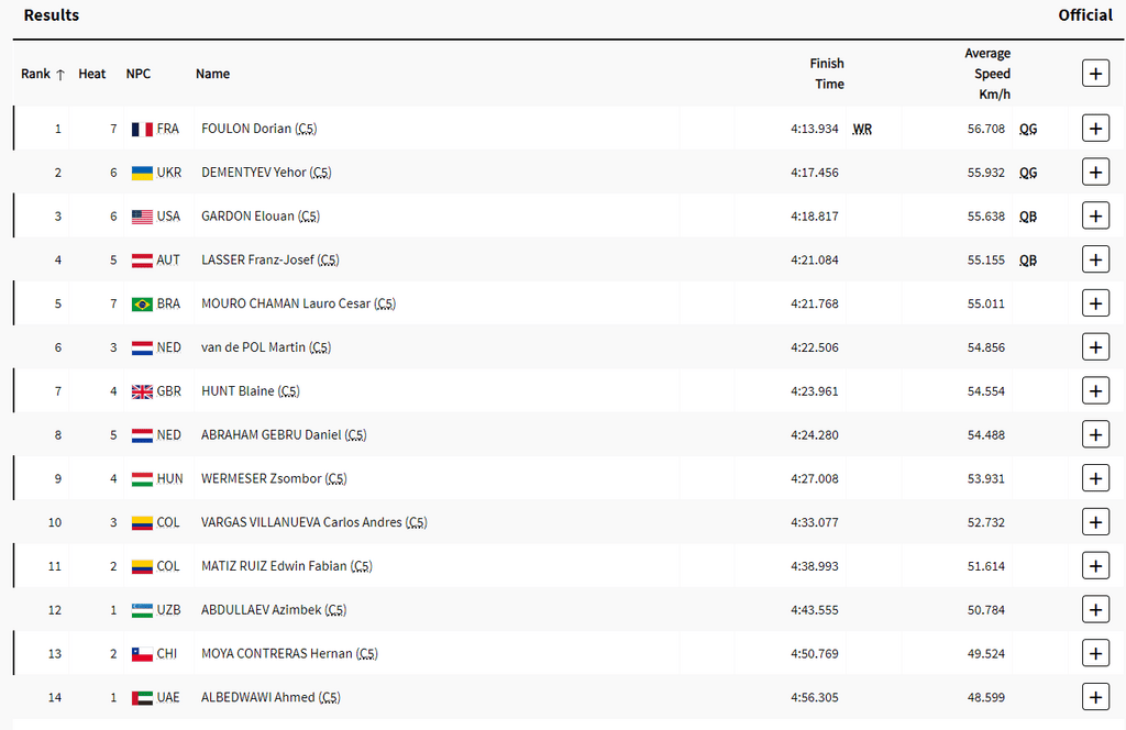 El oro fue para el francés Dorian Foulon, que superó en la final al ucraniano Yehor Dementyev, con un tiempo de 4:16.158, frente al 4:17.770 de su rival. El bronce fue para el estadounidense Elouan Gardon (4:18.880).
