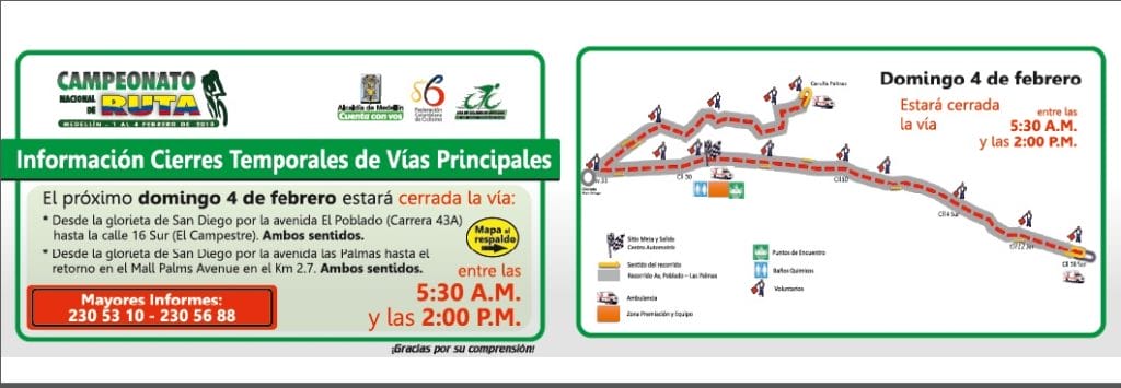 La primera será la contrarreloj individual el próximo viernes 2 de febrero. El trazado comprende una distancia de 28 kilómetros con salida y regreso al Puente Guayaquil, tomando la Autopista Sur hasta Itagüí. La segunda, el domingo 4, será el gran fondo. Los ciclistas darán 14 vueltas a un circuito de 16.7 kilómetros hasta completar un total de 233.8 kilómetros.