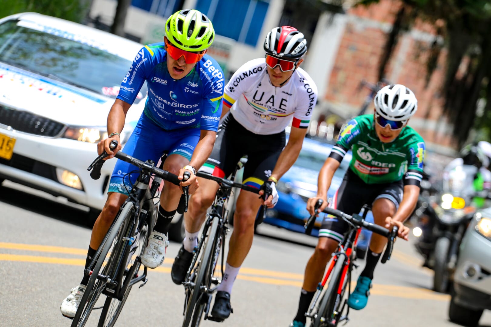 Juan Suárez (Supergiros), Heberth Gutiérrez (UAE ) y Alonso Echavarría (Orgullo Paisa) conformaron la fuga que más tiempo sacó de diferencia con el grupo. Foto: Anderson Bonilla.