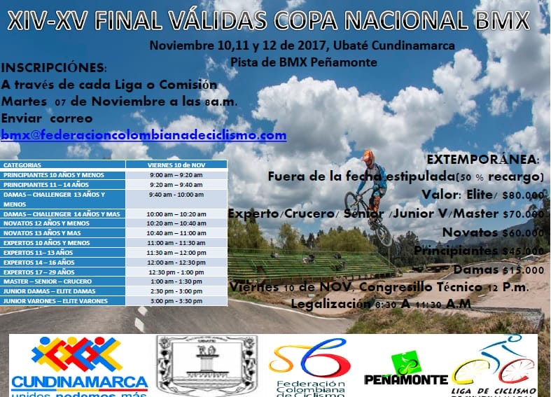 La pista Peñamonte de Ubaté será sede de la gran final de la Copa Nacional de BMX 2017. Allí se llevarán a cabo las XIV y XV Válidas de la especialidad con la presencia de los mejores especialistas del país, del 10 al 12 de noviembre.