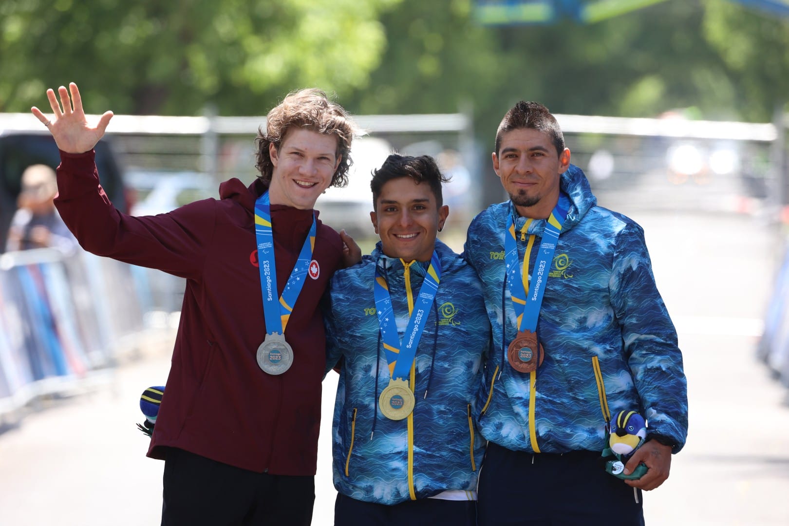 Alejandro Perea (oro) y Esneider Muñoz (bronce) en el podio de la prueba de ruta C1-C3 de Santiago 2023