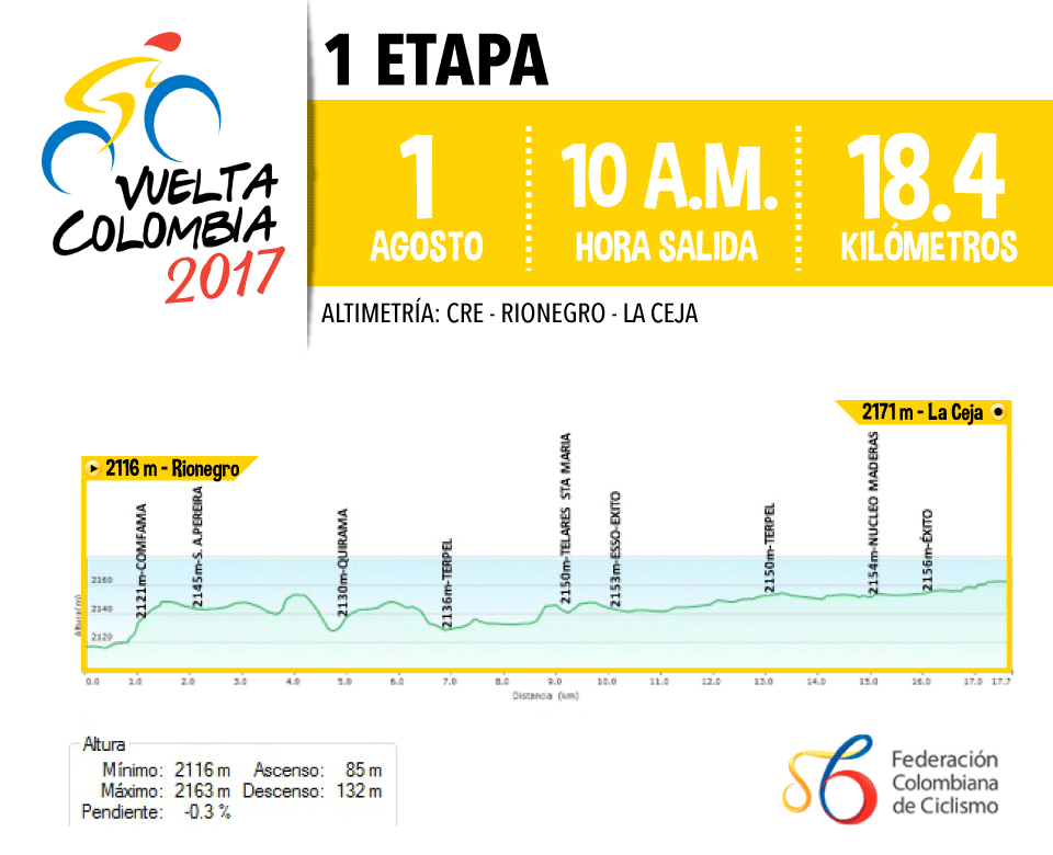 El trazado comprende un recorrido de 18.4 kilómetros con salida en Terpel de la calle 43 con carrera 50, y llegada al parque principal de La Ceja, escenario desde el que también partirá la fracción del día miércoles.