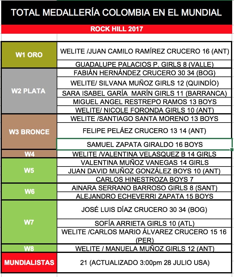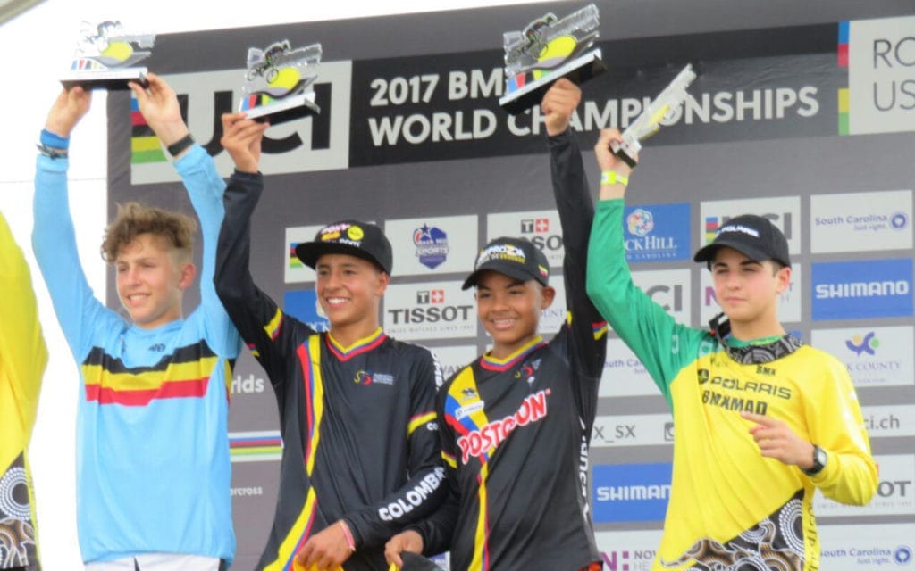 Cumplida la tercera jornada del Campeonato Mundial de BMX, en Rock Hill, Estados Unidos, la delegación colombiana suma un total de 10 medallas (dos oros, cinco platas y tres bronces) que dejan en evidencia el progreso de las categorías de base del bicicrós colombiano.