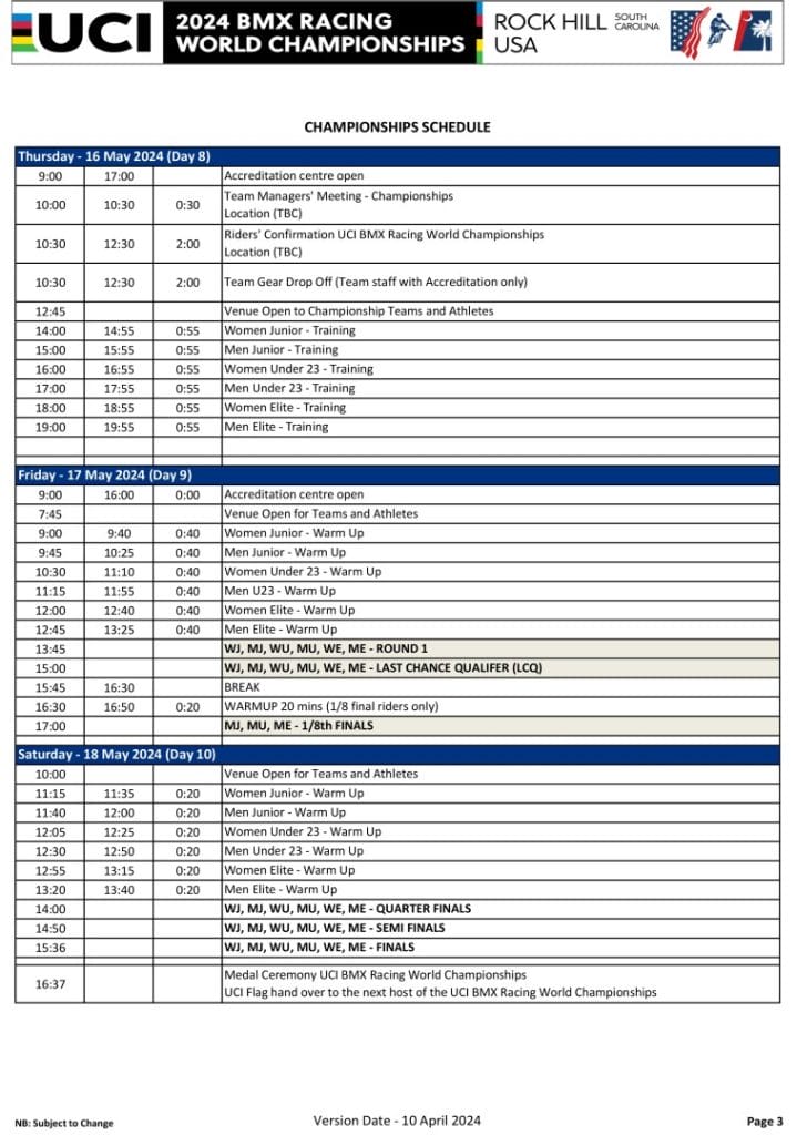 Este viernes y sábado se estarán disputando las competencias en las categorías junior, Sub-23 y élite Championship, en el Campeonato Mundial de BMX Racing, que se realiza en la pista de RockHill, California, en los Estados Unidos, último evento UCI que entregará puntos para el ranking olímpico camino a París 2024.