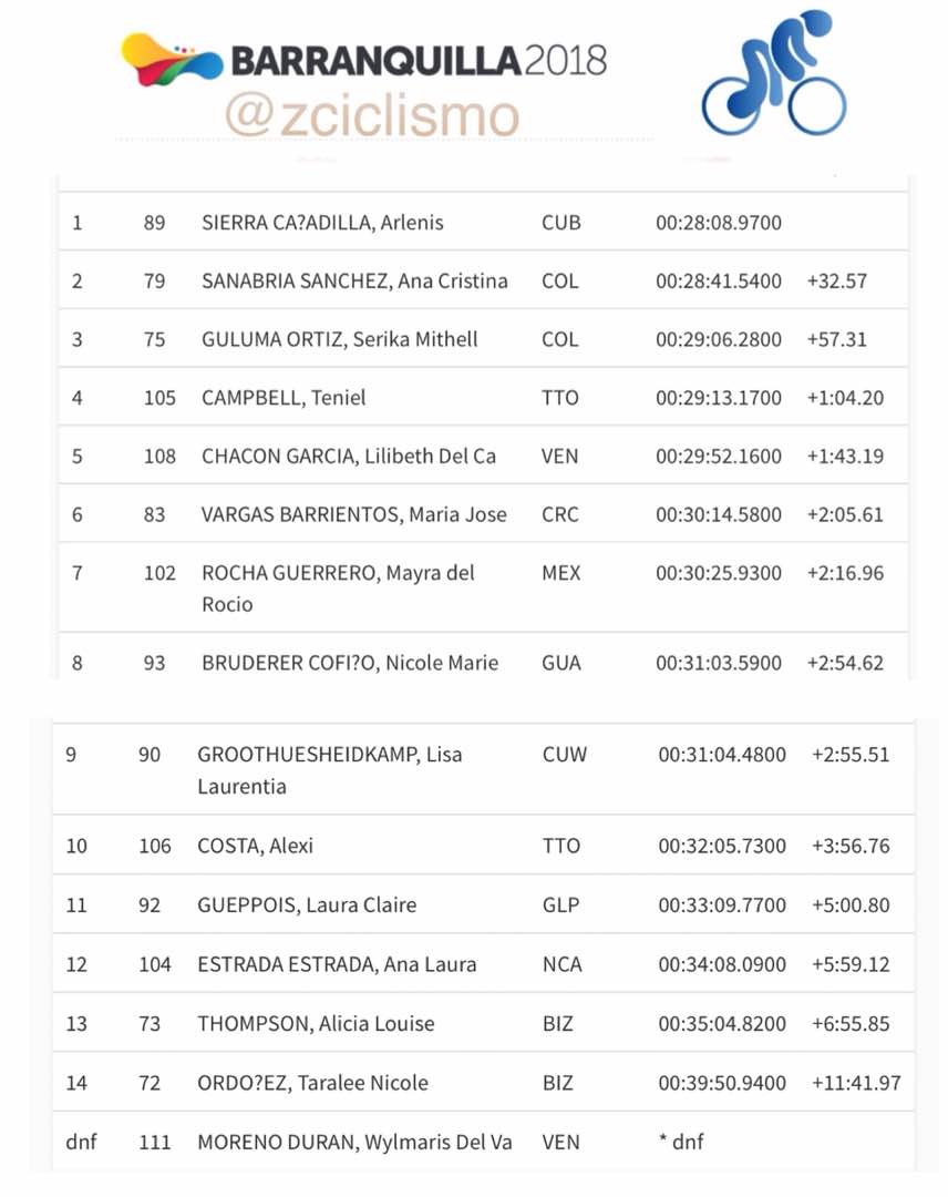 Las colombianas cumplieron su participación en el circuito diseñado por el cruce de Dapa, vía antigua que conduce al municipio de Yumbo. Allí, luego de cumplir dos giros y un total de 21.2 kilómetros, la ganadora fue la cubana Arlenis Sierra, ciclista profesional del registro de Astana, que finalizó el trayecto con un tiempo de 28 minutos, ocho segundos y 97 centésimas.