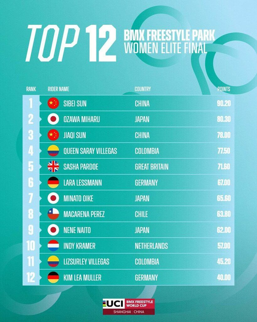 La ciclista colombiana Queen Saray Villegas Serna logró un destacado cuarto lugar durante su actuación en la final de la Copa Mundo UCI de BMX Freestyle, que se realizó en el marco de la World Series FISE de Shanghái, en China.