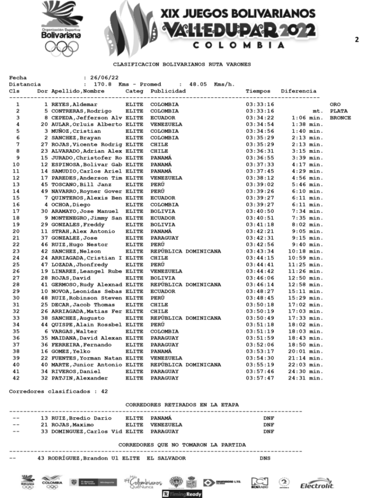 Dominio total en la rama masculina del ciclismo de ruta para Colombia, que se llevó los dos oros y las dos platas en disputa, y ratifica a nuestro país como la mayor potencia del área bolivariana, sumando un nuevo título y manteniendo la racha de triunfos en la prueba de fondo, que también fue ganada por Juan Pablo Suárez, en Santa Marta 2017; Fernando Gaviria en Trujillo 2013, y Giovanny Báez en Sucre 2009.