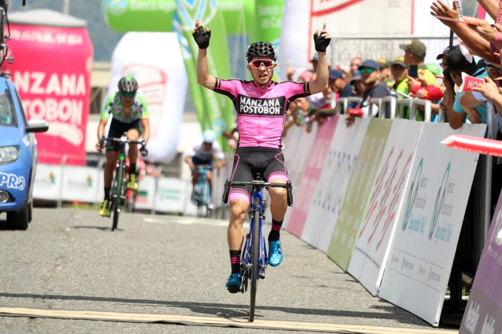 El antioqueño Sergio Higuita (Team Manzana Postobón) festejó en la llegada de la tercera etapa de la Vuelta a Colombia Ministerio de Transporte y Seguridad Vial, que partió desde Armenia y finalizó en la Torre de Chipre (Manizales), tras 187 kilómetros de recorrido.