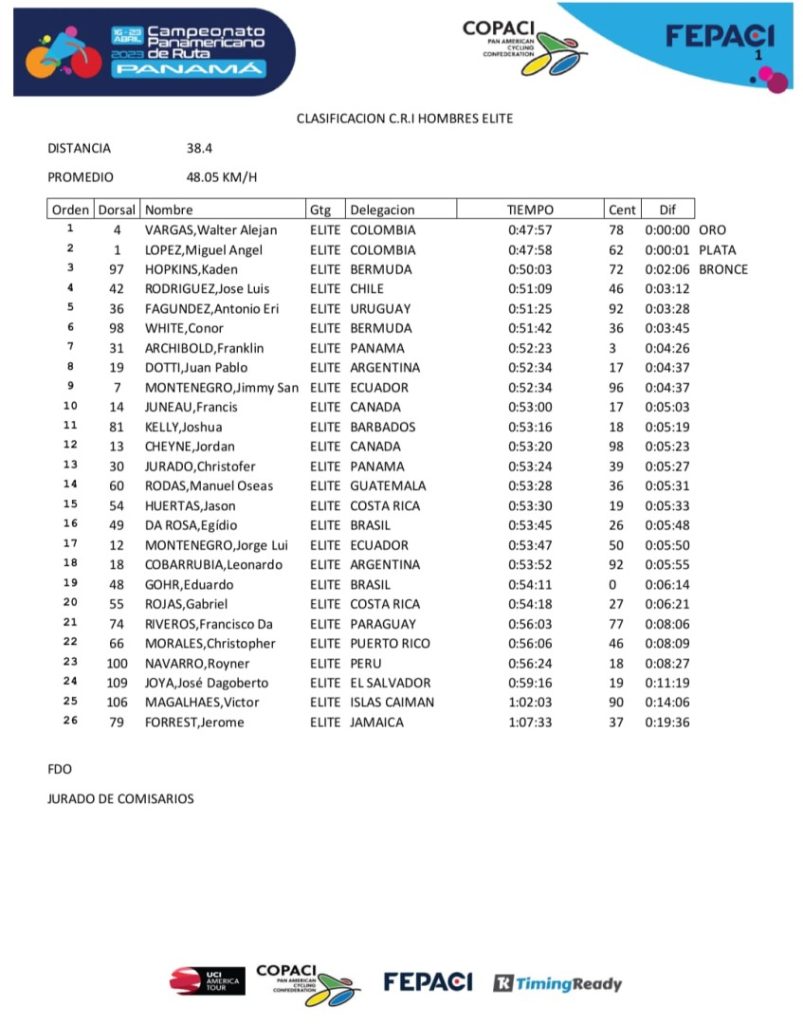 Colombia se baño de oro nuevamente en la contrarreloj del Campeonato Panamericano de Ruta, luego de obtener el primero y segundo lugar en la categoría élite, con Walter Vargas y Miguel Ángel López, que brindaron un gran espectáculo en el circuito de carretera Gonzalillo-Pedregal, en Ciudad de Panamá.